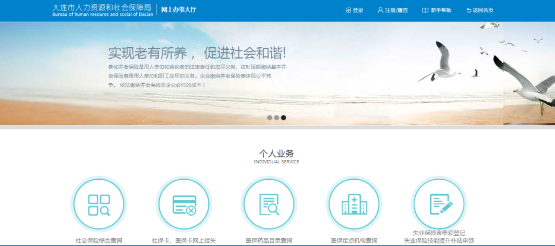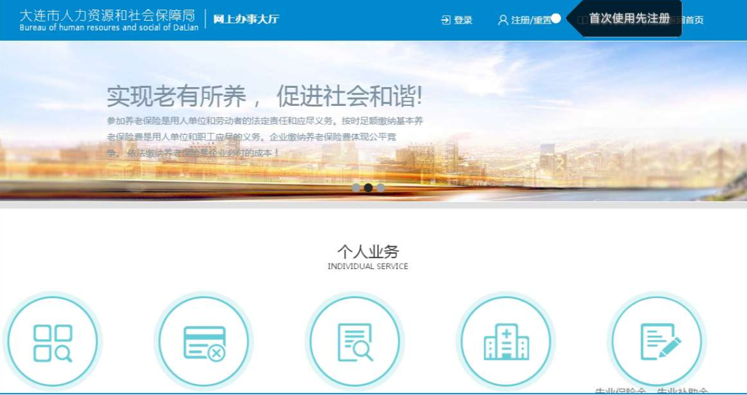 步驟一:失業(yè)人員本人通過計算機登錄大連市人力資源和社會保障局-網(wǎng)上辦事大廳→個人業(yè)務(網(wǎng)址:http://bsdt.dlyun.work/personal.jsp)