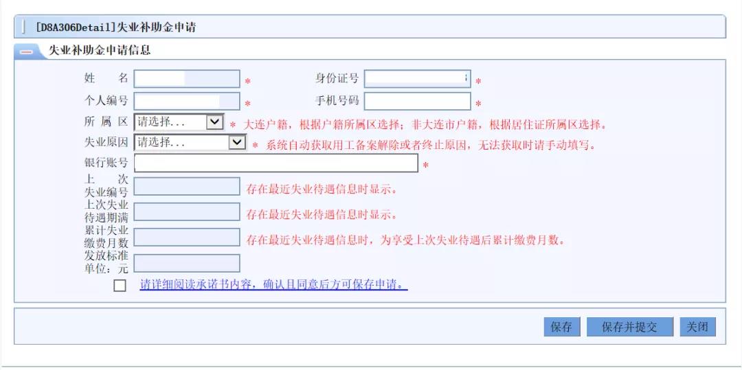 步驟四:點擊失業(yè)補助金申請模塊,系統(tǒng)自動獲取社會保障卡號,錄入個人基本信息(填報信息里帶*號的必填,不帶*號的不用填),簽訂申領失業(yè)補助金承諾書,在確認無誤后按“保存并提交” 鈕上傳申領數(shù)據(jù)。如持有承載失業(yè)保險待遇發(fā)放的八家銀行(工商銀行、農業(yè)銀行、中國銀行、建設銀行、交通銀行、大連銀行、郵政儲蓄銀行、農商銀行)的社會保障卡,需先到社?òl(fā)卡銀行開通社?ń鹑诠δ(開通后五個工作日后再申請),確保正常領取失業(yè)補助金待遇。如持有其他銀行的社?▌t需錄入大連銀行卡號申領。